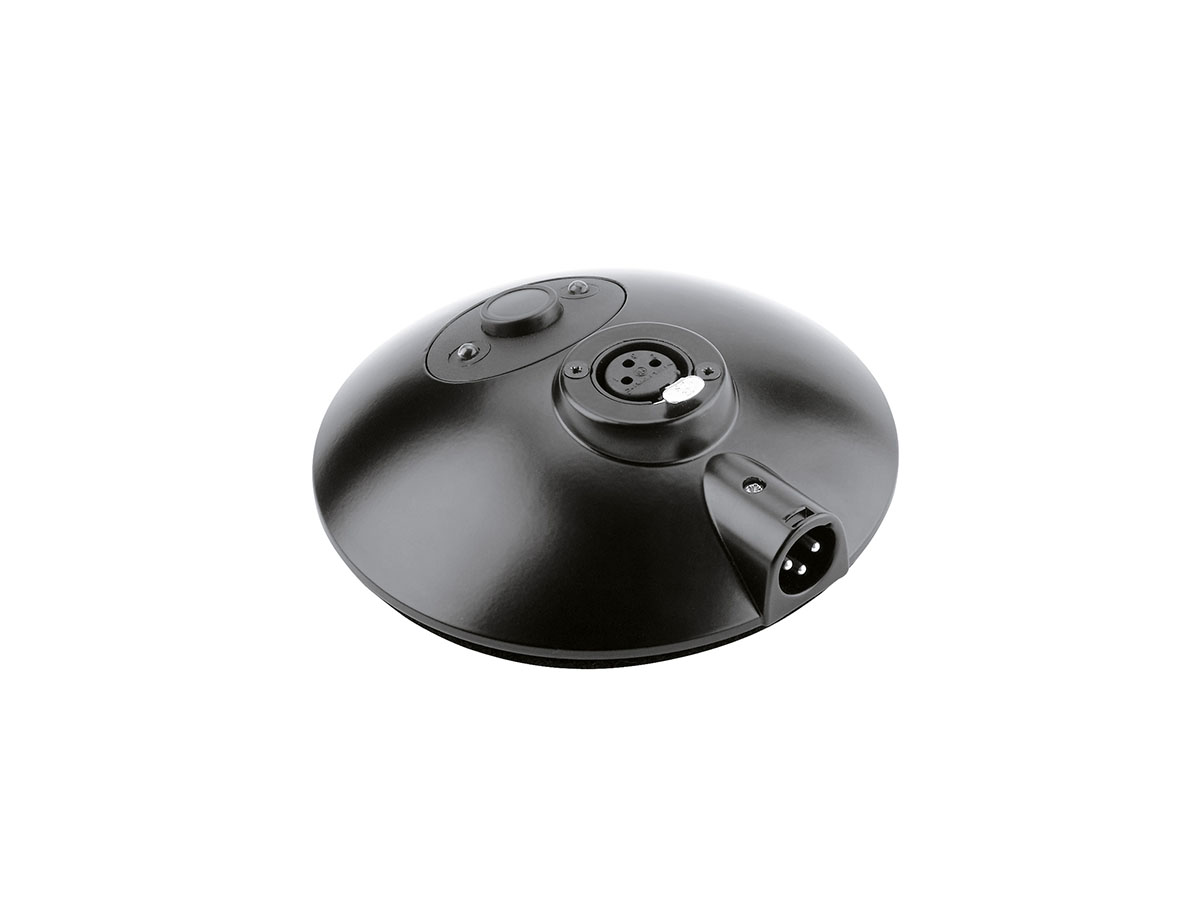 Beautifully designed, compact, zinc die-cast base. 3-pin XLR connections (male/female), completely mounted, crackle-free switching, with phantom powering-pilot light, with pushbutton "push-to-talk" (black). Two diodes indicate the operating state (voltage / microphone ON/OFF).
