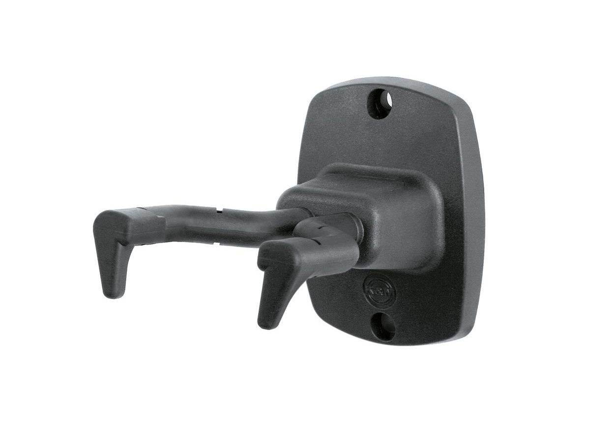 Screw-on type wall mount which accommodates a wide variety of guitar shapes. Features a patented flexible hooking-in and clamping system which quickly and firmly grasps the guitar neck. Studs at support arms provide extra protection. Support arms are covered with non-marring rubber to protect the instrument. Mounting plate made from high quality plastic material.