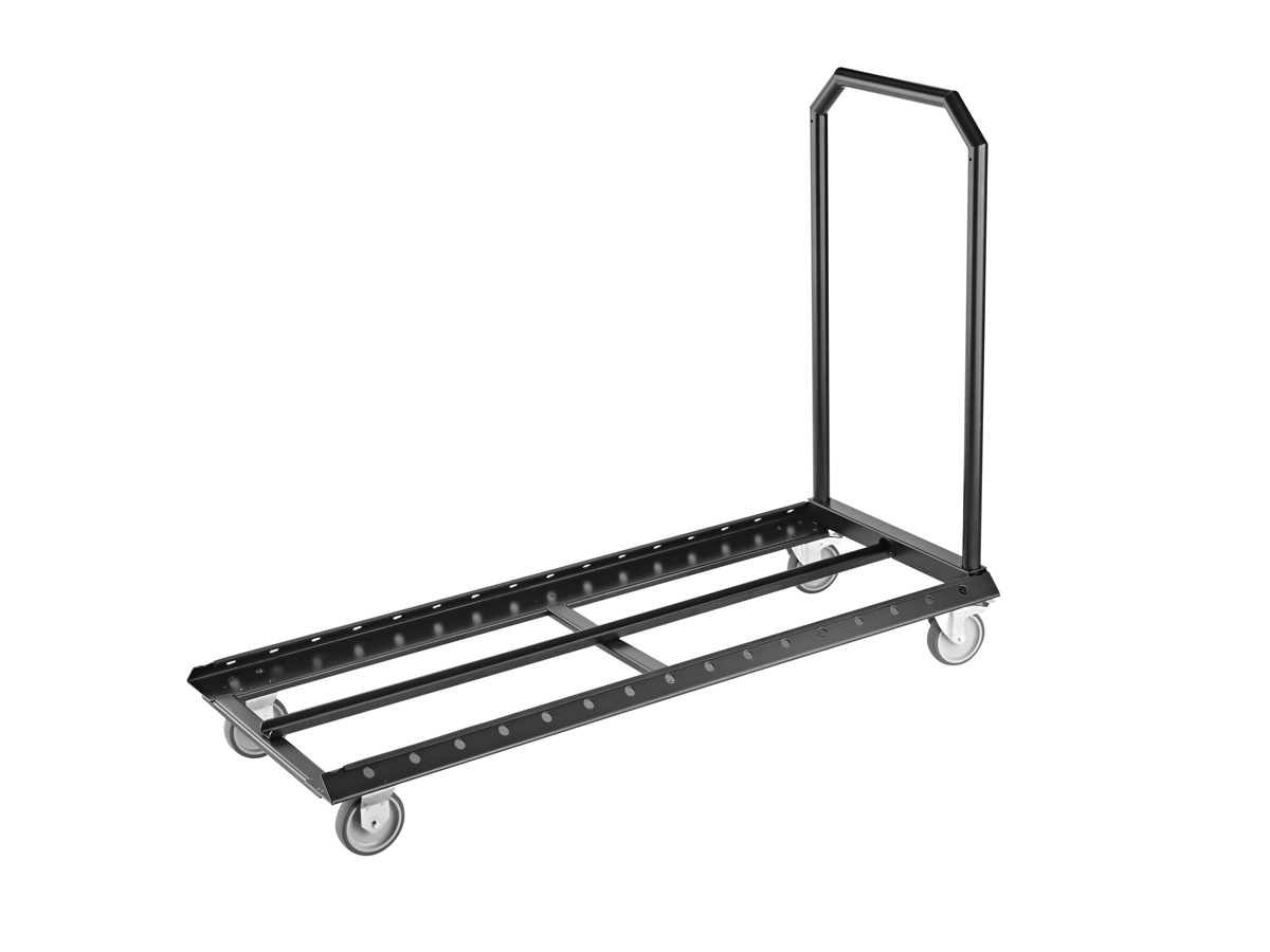 Very solid and robust wagon for up to 12 stackable orchestra music stands 11924, 11925 and 11930. The wagon is equipped with two lockable swivel castors and two fixed castors. Various rails and a rope safety device ensure that the desks stand securely without tipping over. Without desks, the 1,180 mm long and 490 mm wide wagon can also be stacked to save space