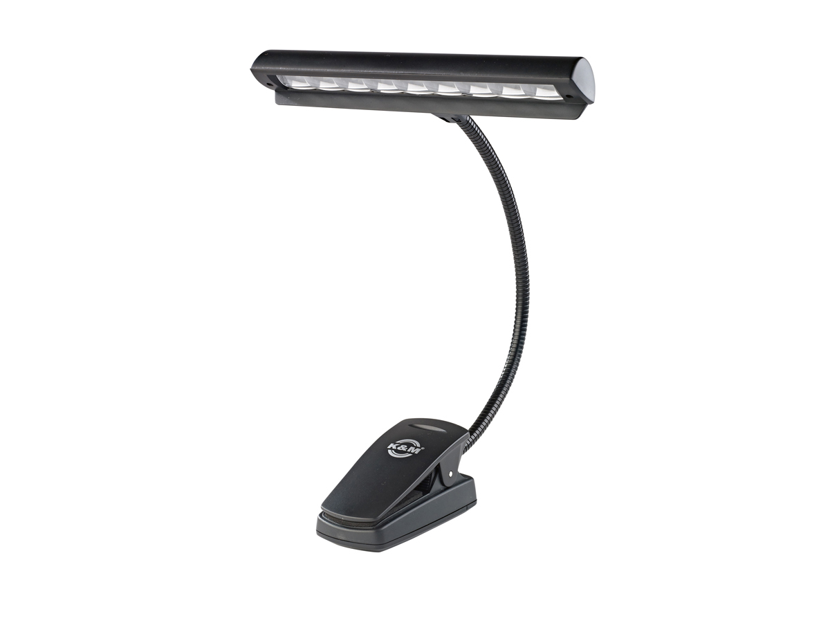 Professional orchestra light with batteries and power supply. Nine extra bright and energy-efficient LEDs provide consistent and vibrant lighting. The flexible gooseneck is fully adjustable. The light has a switch with two brightness levels. The light cone is limited to the music sheet through an anti-glare shield. An extra-strong clip provides a secure grip on music stands. The complete set is comprised of 3 AA 1.5V batteries, a power supply with a 3 m cord, as well as a durable carrying case.