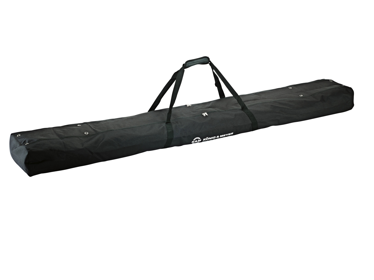 To store and transport two lighting/speaker stands 246/1. Sturdy nylon fabric, water-resistant. Two inside compartments and two parallel zip closures with large carrying straps. Black with green K&M logo.