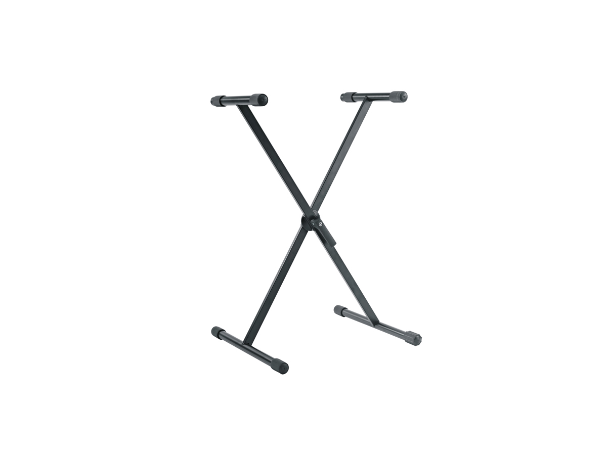 The new generation of X-Stands is comfortable and convenient. The ergonomic clamping mechanism makes setup or folding easy and fast. The robust metal joint can be adjusted in 5° intervals; the short intervals provide the user with a multitude of positions. With the assistance of a scale the user is able to easily find his preferred setting. Both of the back rubber end caps can be adjusted on their axis and as such can be adjusted perfectly to the width of the keyboard. The maximum support depth is 350 mm. The typical K&M quality characteristics, such as solid workmanship, high quality surface finishes and practical end caps to stabilize the stand on uneven surfaces round off the overall concept.