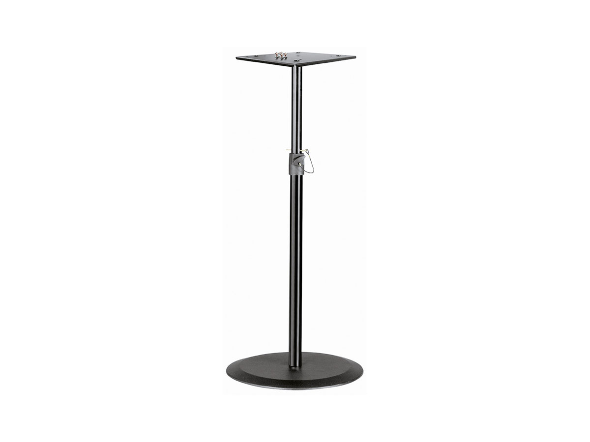 Stable steel stand for monitors with broad completely level round cast-iron base-diameter 450 mm. Rod combination height adjustable using clamping screw and safety splint. For the direct attachment of monitors with 3/8" threaded joint (thread length 12 mm) or to screw in a connector plate 205 x 245 mm for Genelec monitor 1030 or monitors by other manufacturers. Includes 4 thread points and 4 rubber knobs.