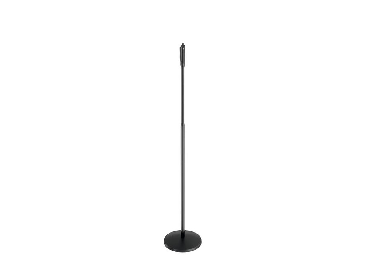 The new star in your show! The avant-garde, one-hand microphone stand is setting new standards in design and function. The elegant combination of triangular-shaped sections and the new design of the slender one-hand adjustment mechanism go harmoniously with standard microphone clips and microphones. The integrated knurled screw is impossible to lose and makes tightening and positioning the microphone clip easy. The stand’s simple elegance loses nothing by the addition of König & Meyer’s classic swivel arm. The height of the stand can be adjusted soundlessly, simply and easily using the unique one-hand clutch. The stand is significantly lightweight, but nonetheless stable due to the ingenious round base with an integrated steel plate with an attractive plastic cover. The base’s circumferential rubber profile reduces undesirable vibration and footfall noise even when the stand is tilted far over to the side. Damage to flooring (e.g. parquet) is also prevented.