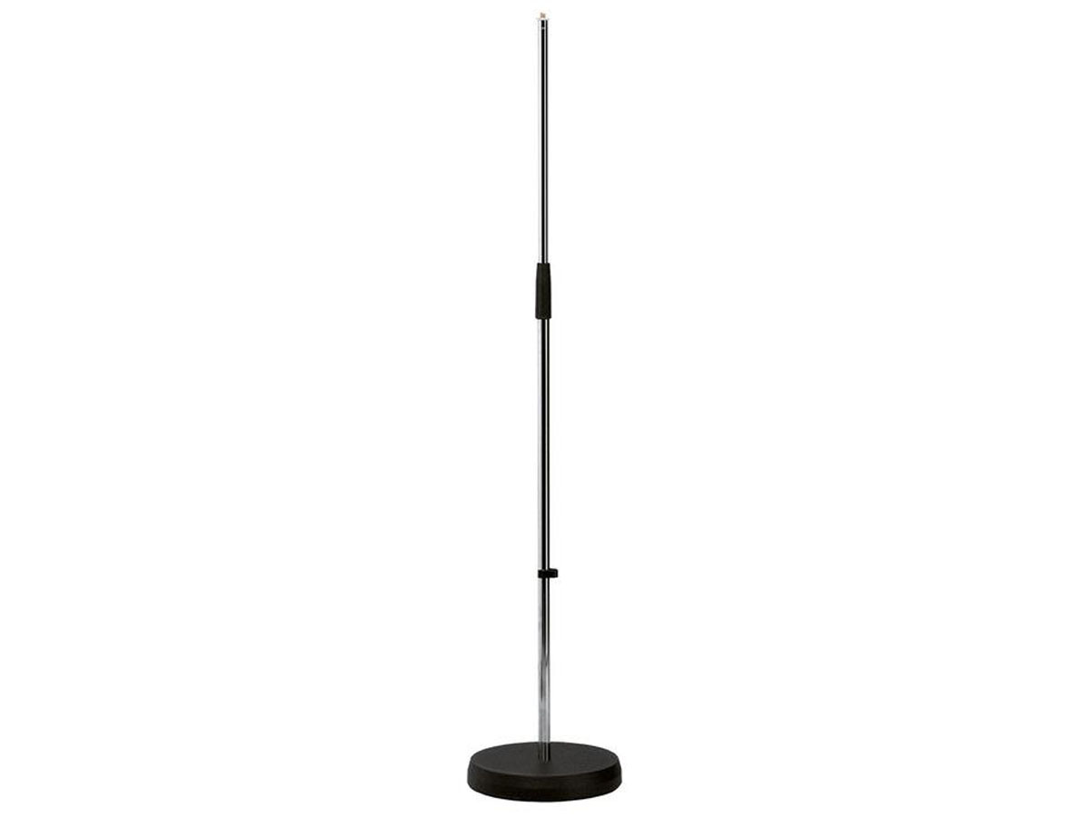 Heavy cast-iron round base, with anti-vibration rubber insert for noise filtration, plastic clutch-style height-adjustment system.