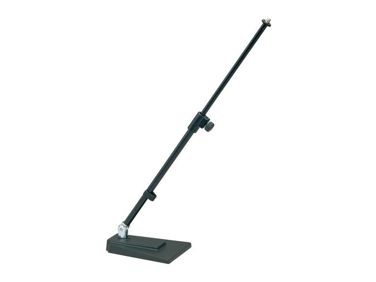 Black rectangular cast-iron base with tilt angle adjustment, 2-piece adjustable extension tubing with non-marring height-adjustment mechanism. Ideal for drums and studios.
