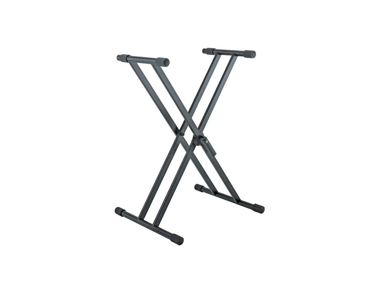 Our best X stand - comfortable and extremely sturdy. The new design of the double brace stand tubes provides for perceptible stability and safety. The ergonomic clamping lever makes it easy to setup and collapse the keyboard stand. The robust metal joint is intermeshed in 5° steps and provides for a multitude of different positions. The scale provides the user with the option to always select their preferred setting. Both of the back rubber end caps can be adjusted on their axis and as such can be adjusted perfectly to the width of the keyboard. The maximum depth is 350 mm. The typical K&M quality characteristics such as solid workmanship, high quality powder coating and a useful adjustable end cap for uneven surfaces complete the overall concept and design. The stand can be expanded for a second keyboard with the 18941 stacker.