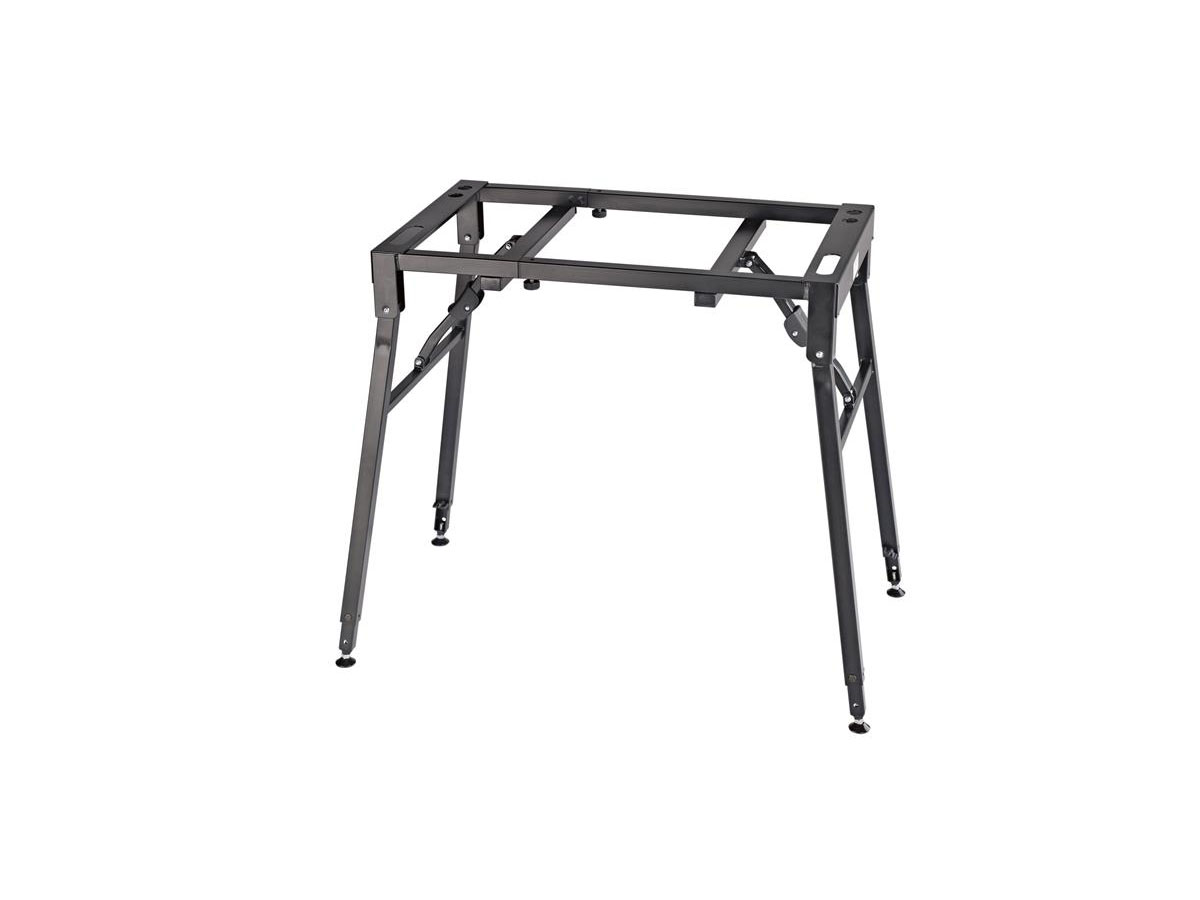The world-renowned table-style keyboard stand has been upgraded. With a height adjustment range from 600 - 1000 mm the keyboard stand can now be used while standing or sitting. Adjusting the table does not require any tools. As before our keyboard stand impresses through its stability and flexibility. The stand is equipped with height adjustable legs with integrated levelling feet for uneven surfaces. The keyboard stand is collapsible for easy and compact transport. There is a wide range of expansion options, such as a stacker for a second keyboard, laptop or universal holder, which round off the complete package.