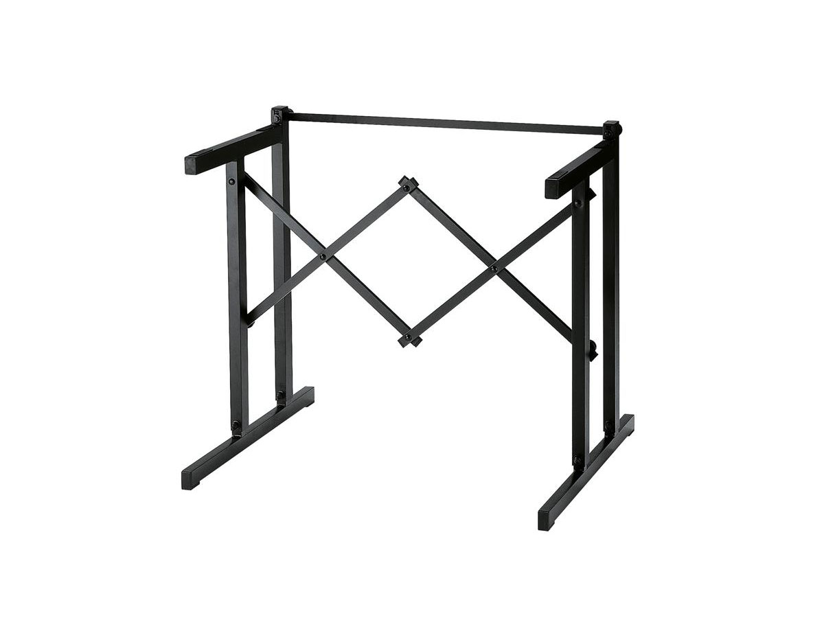 Professional, black powder-coated aluminum keyboard stand. The stand is height-adjustable from 630 mm up to 960 mm. Can be used with stackers to hold additional keyboards.