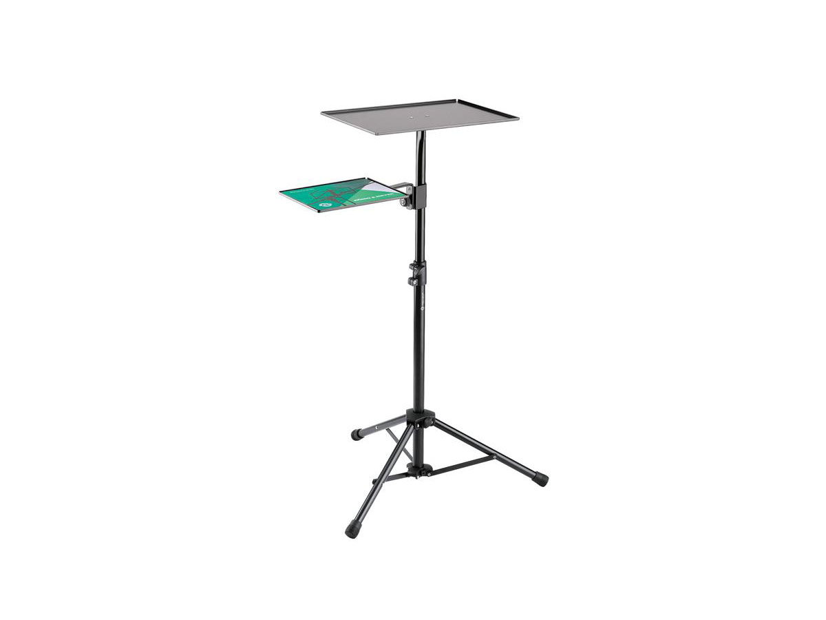 Height adjustable tripod with ergonomic clamping elements. The laptop rest plate can be easily attached to the bottom part by a prismatic connection. Includes a clampable mouse rest.