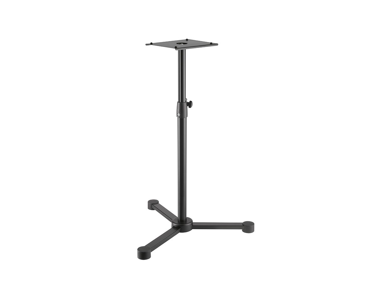 Functional floor stand for near-field monitors and speakers. The solid and well-designed steel construction impresses with its enormous stability and holds your speakers securely in the desired position. The flat tripod construction with large rubber pads ensures acoustic decoupling and a wobble-free stand. The support plate with self-adhesive rubber studs measures 205 x 245 mm. For the optimal listening height, you can choose six levels between 677 and 1132 mm. The slim clamp with safety hook is easy and comfortable to use. Alternatively, the cables can be routed inside the tube (without connector). A load capacity of 35 kg is possible when the load is centred.