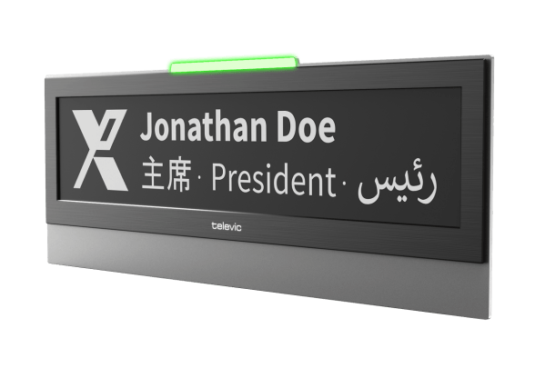 Double-sided nameplate based on E Ink technology to automatically update displays upon delegate's sign in (e.g. with RFID card) or input of the conference manager. Can be daisy-chained on Plixus network or connected directly via USB with multimedia units. Contains button at the base and LED bar indicator at the top for multi-purpose usage (e.g. speech request). CoCon Nameplate required.
