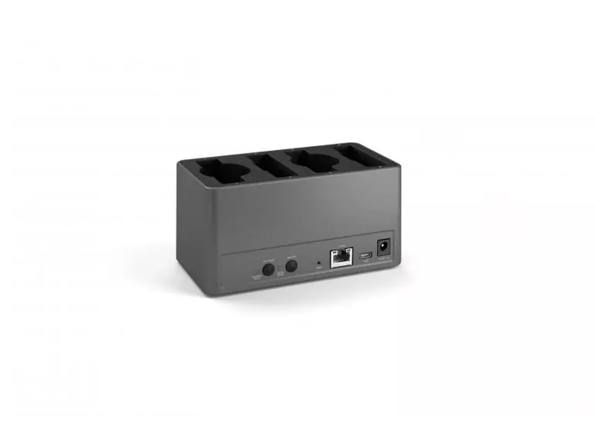 It can be integrated into a network by using the Ethernet connection. With the Unite Manager software, the desktop charger can be monitored remotely. It can also be attached to a table top via two holes at the bottom. The charger provides a maximum of four charging compartments, two of them being compatible with the Unite TH handheld transmitter.