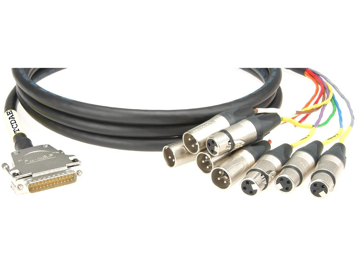 The 25-pin D-Sub connector (Male) has standard TASCAM™ configuration. The pigtails of the individual conductors are made up with XLR connectors (4x XLR 3p. male and 4x XLR 3p. female) and enclosed in an extra-strong self-extinguishing woven sleeve, so that they are suitable for use through a wide range of operating temperatures (-70 °C to +150 °C). The outer jacket has a transparent shrink sleeve at both ends for labelling as required.