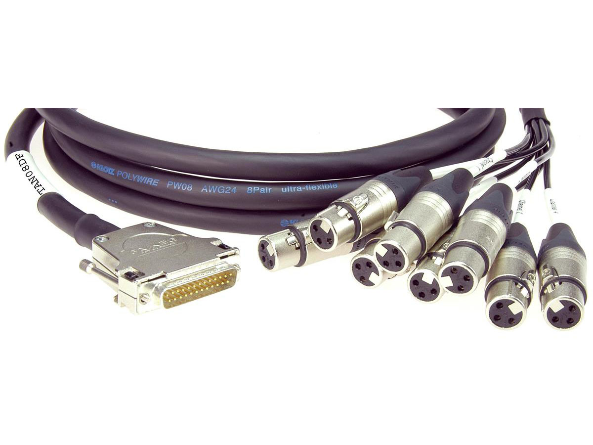 This analogue 8-channel loom can be used in any studio environment with TASCAM™ peripherals – be they recorders, desks, rack gear or interfaces. Our cables are produced from PolyWIRE studio multicore bulk cable, a proven professional-quality product with generous 0.22 m² conductor cross-section and low 85 pF/m. These specs ensure outstanding audio quality.