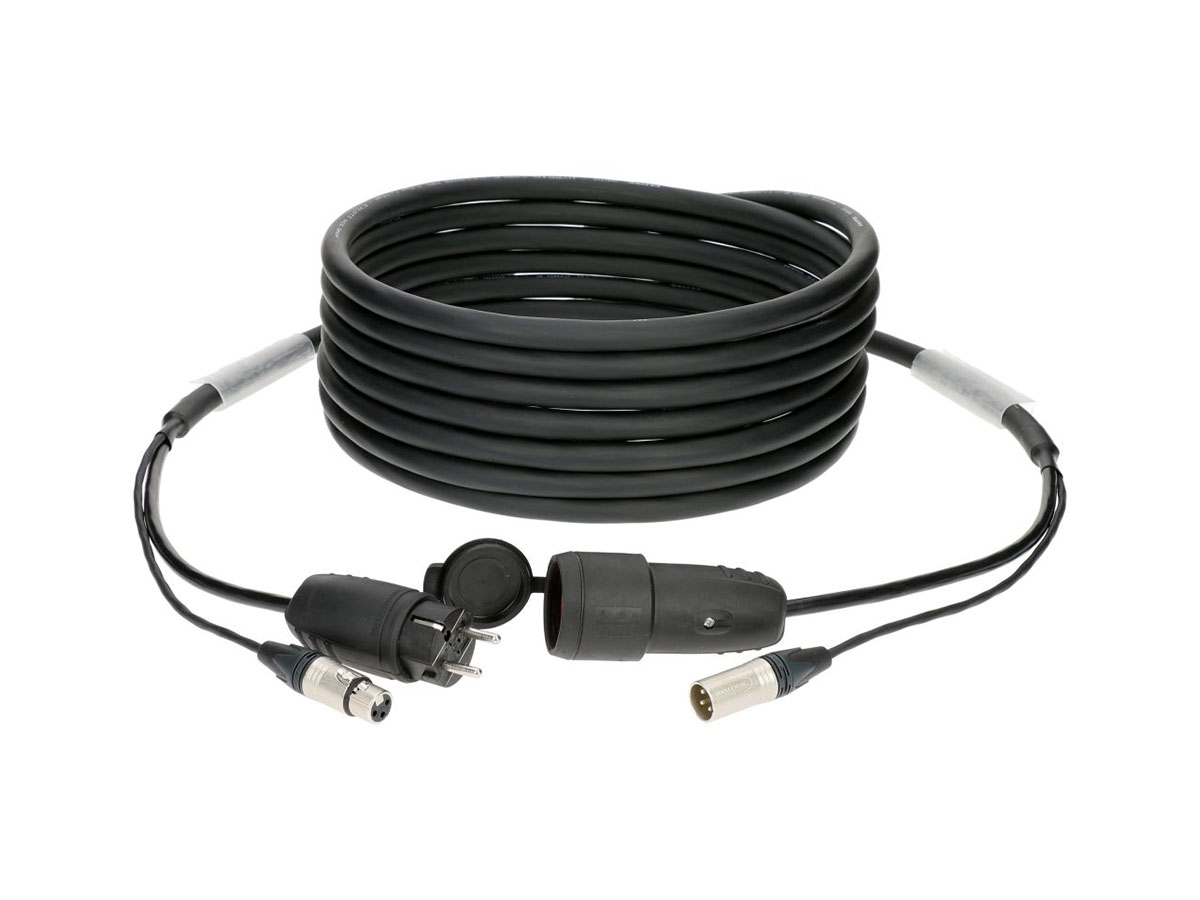 The rugged PVC outer jacket encloses the finely stranded power cable with cross-section of 3 x 2.5 mm² and the double-shielded signal conductor (foil and braided copper shields). They are available with the following connector options: XLR 3p., power CON A, powerCON TRUE1 and earthed plug.