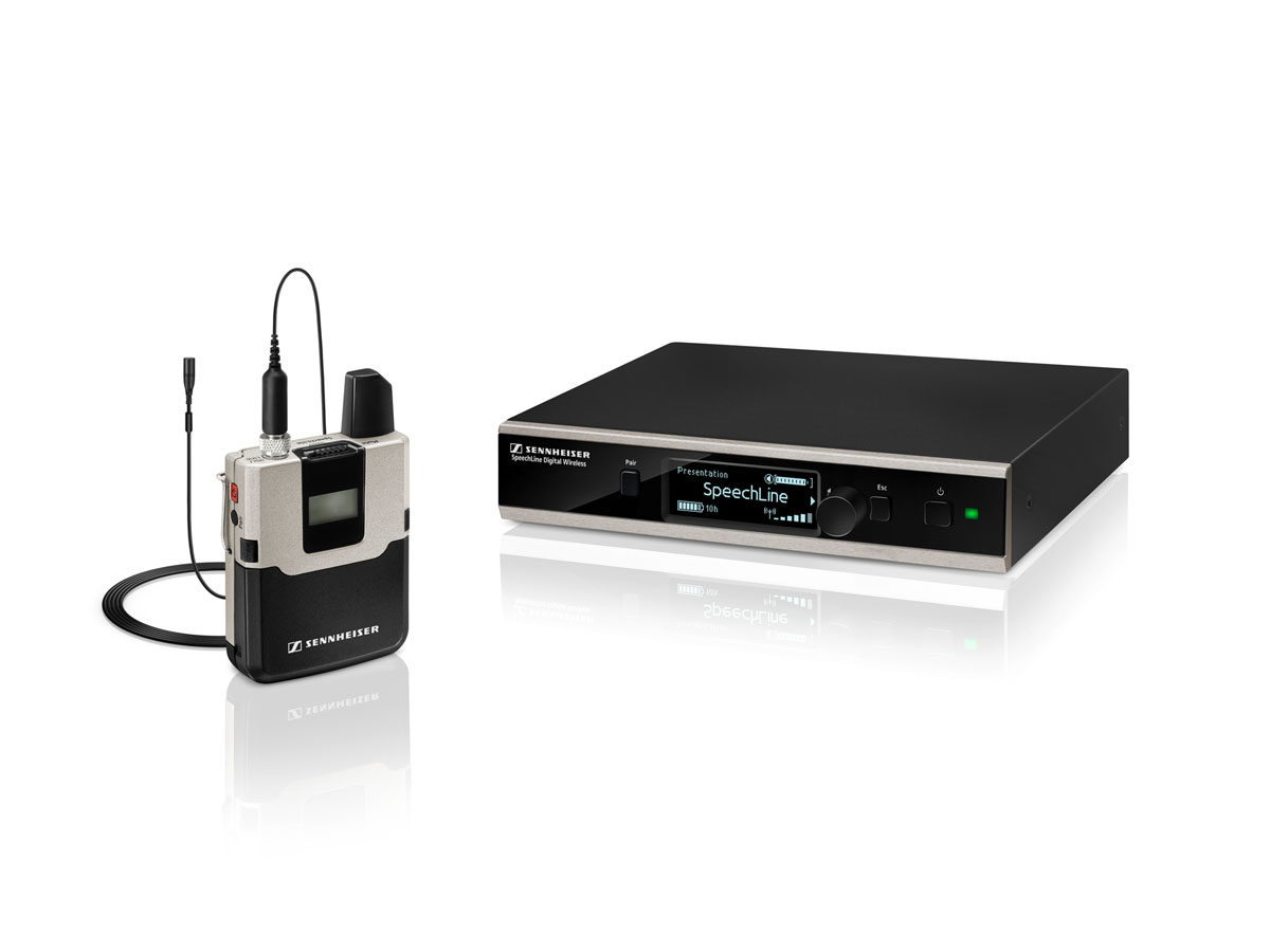 The set includes the bodypack transmitter, stationary receiver and everything to use or install. It comes wiht the MKE 1 condensor lavalier microphone – so not just A lavalier mic, but the best and most unobstrusive one for great presentations with best speech clarity.