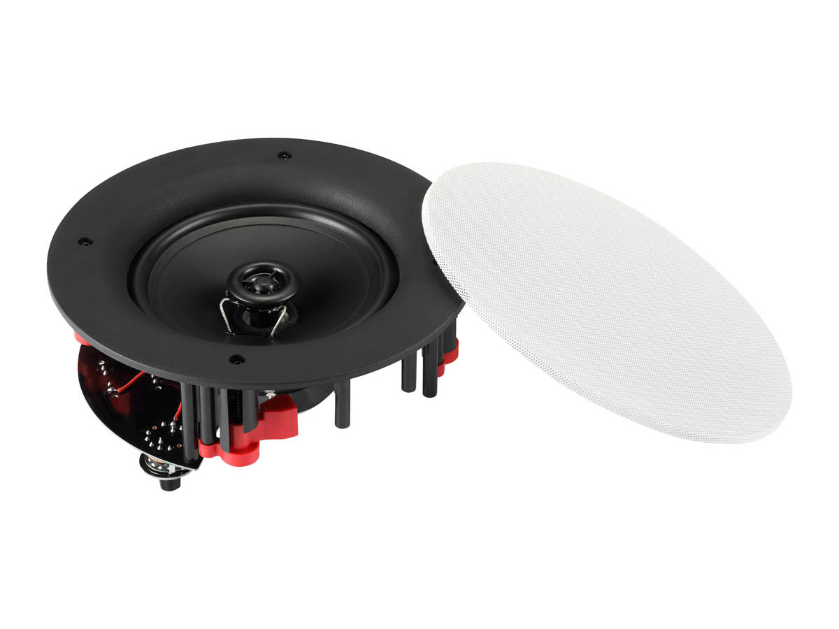 In-Ceiling speaker with transformer tap and white magnetic grille | The C650T features a 6.5" polypropylene cone driver and a 0.5" mylar dome tweeter. With a frequency response of 65 Hz - 20 kHz (-10 dB) and a maximum SPL of 105 dB SPL, it is well suited for both speech and background music applications. The C650T supports low impedance (50W RMS) and 70/100V operation, with transformer taps ranging from 1.25W to 15W. Spring clamp dog-legs makes installation a breeze, and a cardboard cutout template is included in the box. The white magnetic grille locks firmly to the speaker rim, giving the installation a clean and sleek look.