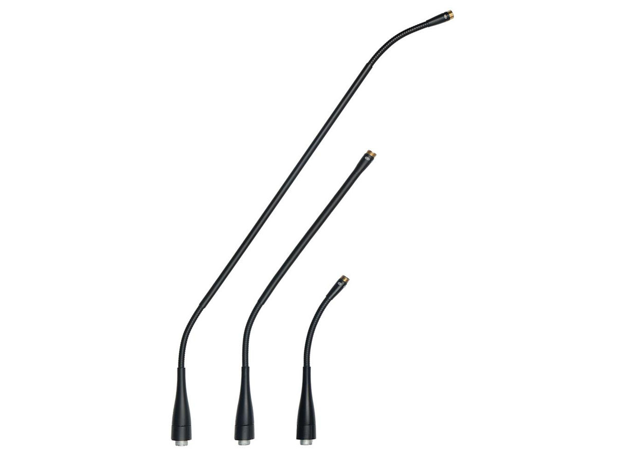 The DAM+ Series reference gooseneck modules for permanent and mobile installation are available in three different lengths: 165mm (6.5in), 300mm (11.8in) or 500mm (19.7in). The extremely slim and rugged gooseneck modules feature an LED ring which indicates whether the phantom power is on or off. A special light-ring expander comes with every DAM+ gooseneck module to improve the visibility of the LED ring if necessary.