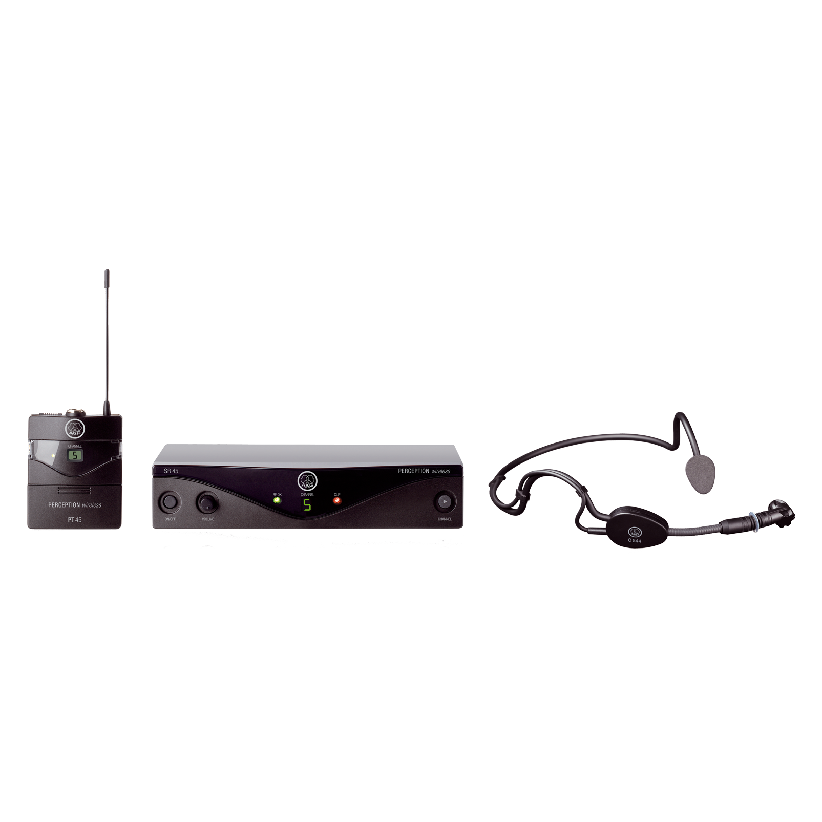 Frequency agile wireless microphone system including SR45 Stationary Receiver, PT45 Pocket Transmitter, SMPS Switched Mode Power Supply (EU/US/UK), C544L Headworn Microphone, 1 AA Battery