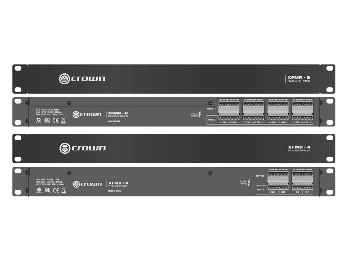 The Crown XFMR-4 and XFMR-8 are rack-mountable transformers to provide impedance matching between amplifier outputs and “constant voltage” loudspeakers. This unit allows amplifiers without direct 70Vrms or 100Vrms output capability to drive distributed speaker systems designed to operate at those voltages.