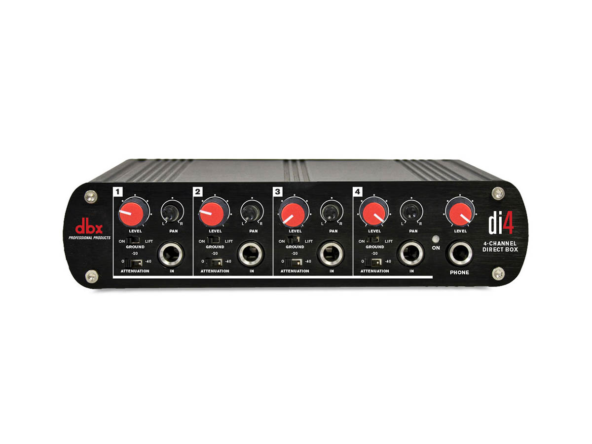 4-channel direct box that converts unbalanced signals into balanced output for use with mixers, PAs, recording consoles and more