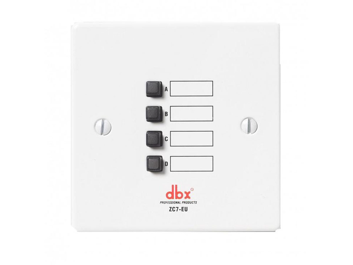 The remote device shall provide programmable push-to-talk page assignment for the dbx® ZonePRO™ devices. The remote device shall have DIP switches allowing identification with connection to the processing device via CAT 5 cable on RJ-45 connectors. The device shall be a dbx ZC-7-EU remote controller.