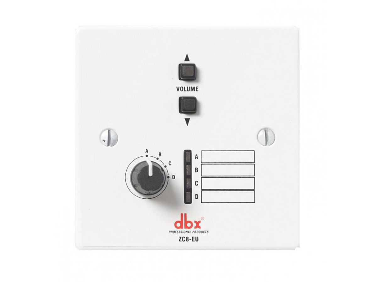 The remote device shall provide both programmable push-button up/down volume control, and programmable rotary switch source selection for the dbx® ZonePRO™ devices. The remote device shall have DIP switches allowing identification with connection to the processing device via CAT 5 cable on RJ-45 connectors. The device shall be a dbx ZC-8-EU remote controller.