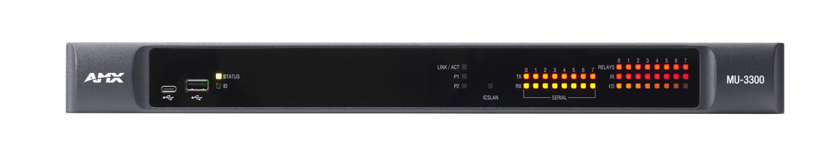 The MU-3300 is a 1 RU device and includes 8 serial ports, 8 relays, 8 IR ports, and 8 I/O ports. An ICSLan network port provides an isolated network for controlled devices.