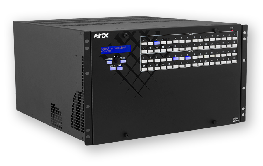 The new Enova DGX 3200 Enclosure (DGX3200-ENC) is a Digital Media Switcher that is ready to support 4K and Ultra High Definition (UHD) content. This robust solution includes a NetLinx® NX Integrated Controller, redundant power supplies and can be populated with Enova DGX video input and output boards in addition to optional audio -switching boards. There are four connections per video board, and each enclosure holds eight video input boards and eight video output boards for a maximum matrix of 32x32.
