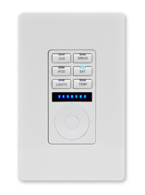 The MET-6NE Metreau 6-Button Ethernet Keypad with Navigation features source control, a navigation wheel that adjusts levels and provides up, down, left, right and select button options, as well as an LED bar for visual level feedback. The MET-6NE can be used as an individual keypad or in conjunction with the 7 or 13-Button Metreau Ethernet Expansion Keypads. The Keypad connects to the controller via Ethernet, which simplifies installation and connectivity.