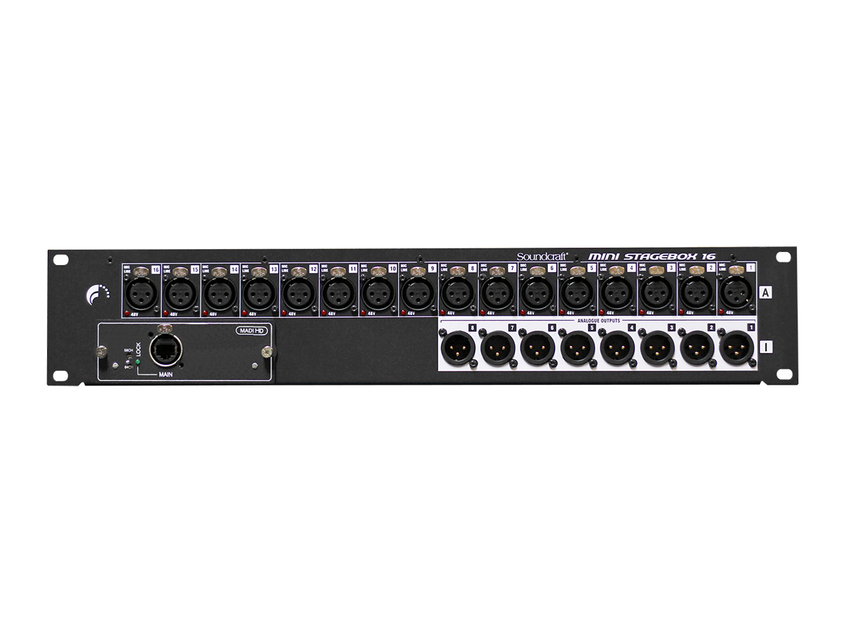 The Mini Stagebox 32R (3U) provides 32 analogue inputs and 8 analogue line outputs, with 4 pairs of AES outputs, providing a total I/O capacity of 32 inputs and 16 outputs, with the Mini Stagebox 16R (2U) model providing 16 analogue inputs and 8 line outputs making a 16 x 8 matrix. They connect to any of the Soundcraft Si Expression, Si Compact, Si Performer, Si Series and Vi Series consoles via a MADI card fitted to the option card slot.