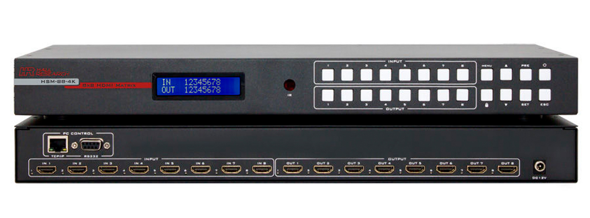 Supports 4K UHD resolutionHDCP 2.2 and HDCP 1.4 compliantFast-Switch™ technologyRS232, IP, IR and intuitive front panel controlTwo-line character LCD on front panel for status indicationUses Hall Research Genesis™ Control Command Set (GCCS)