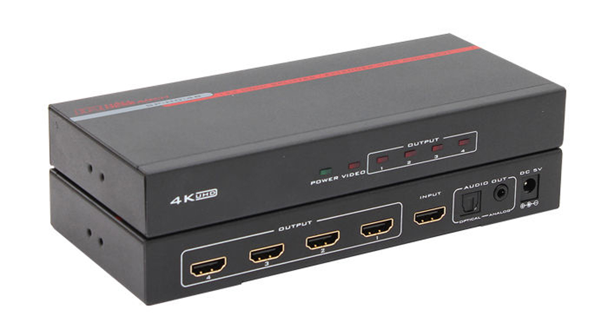 Lossless Ultra HD 4K distribution to (4) UHD or HD outputsSupports PC & HDTV resolutions up to 4K x 2K@30Hz (4:4:4),1080P@120Hz, and 1080P 3D@60HzSupports 30/36/48 bits per pixelFull 3D video support including frame packing up to a 297MHz TMDS clockLED status indicators for power, source signal, and 4 output connectionsAnalog and digital audio extraction via L/R and SPDIF outputs