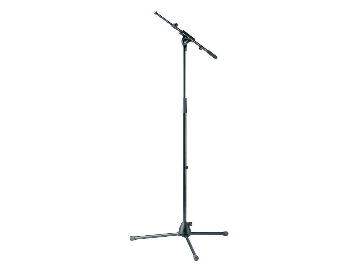 Inexpensive stand with professional features. Fiberglass-reinforced plastic base with foldable legs. Complete with extendable boom arm