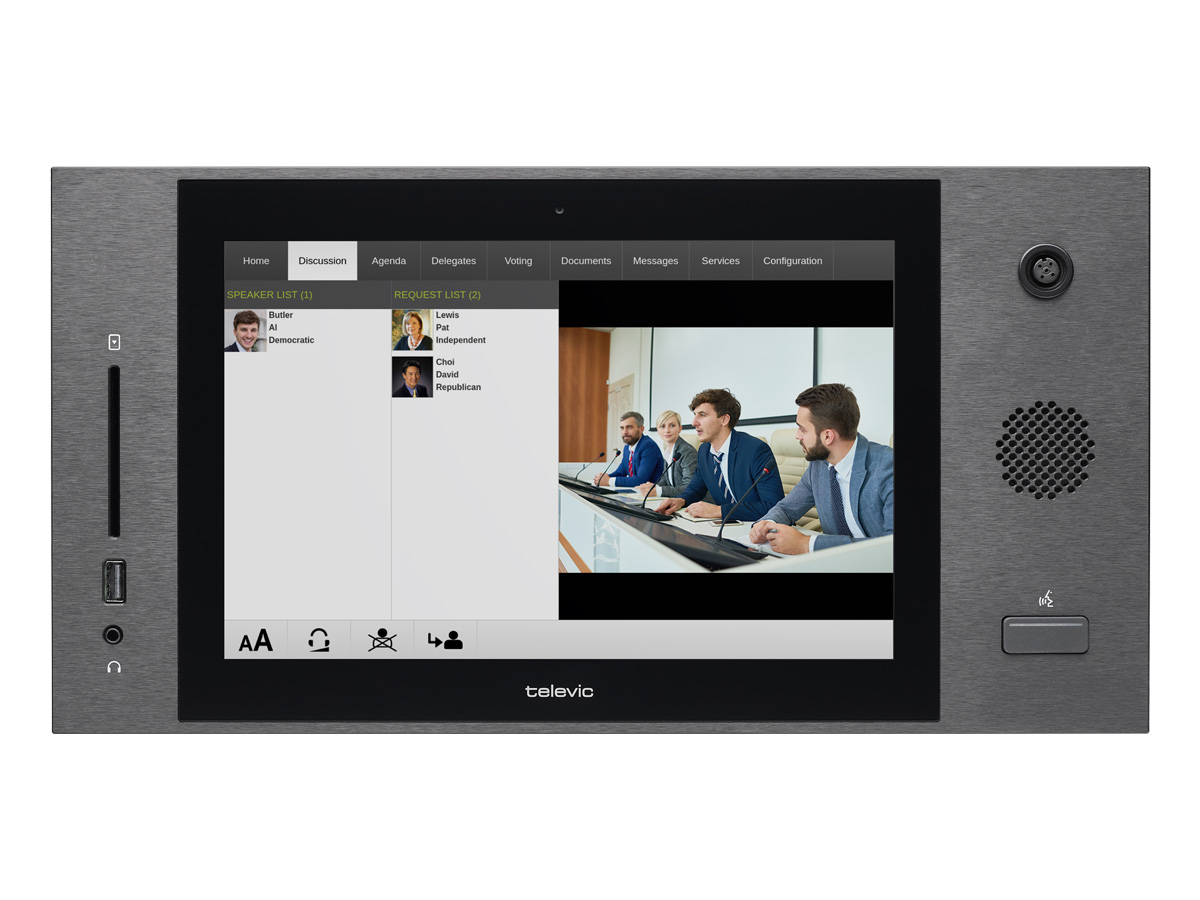 Participants have access to all audible and visual information on their own uniCOS unit. They can speak, see, hear, and interact with delegate stations by combining video, audio, and document sharing on a 10" touchscreen. The unit is easy to install via a single CAT 5e cable, and power is delivered over the Plixus network. The unit can be purchased with an adapted mounting bracket.